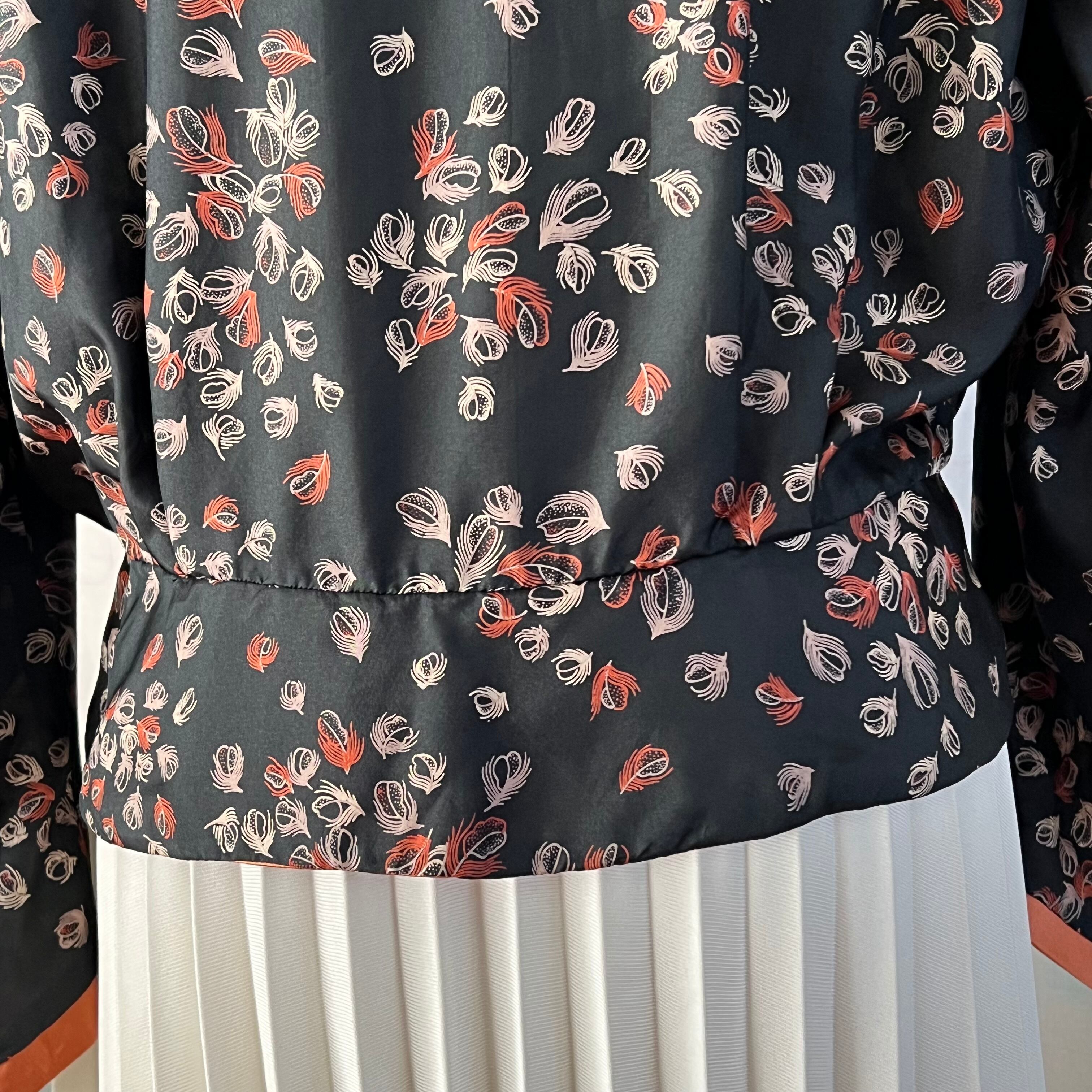 折り返されたダブルの前たてと袖口、ペプラムの内側に使われたレンガ色が印象的。