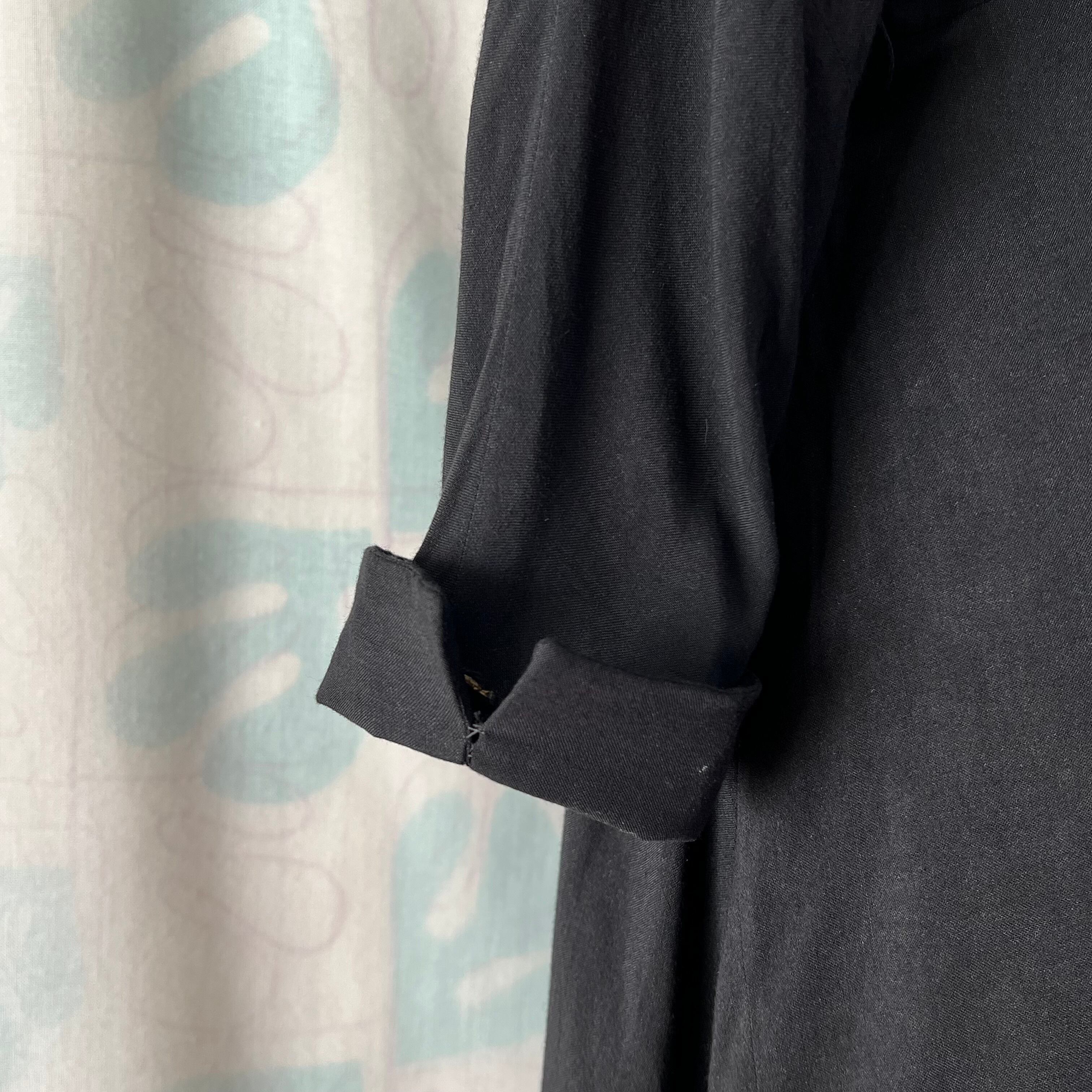 大きな襟とロールアップカフスは張りのある仕上げ。