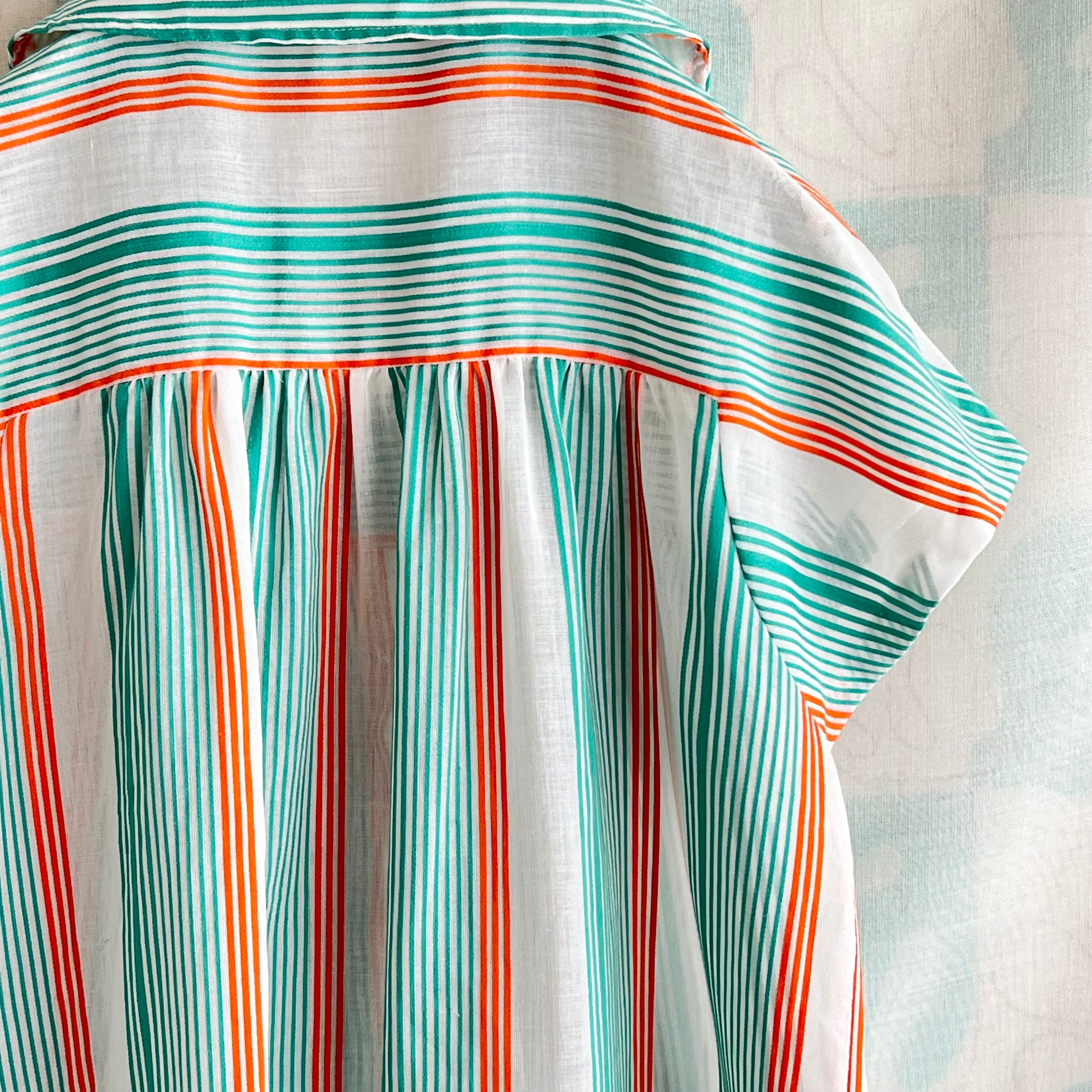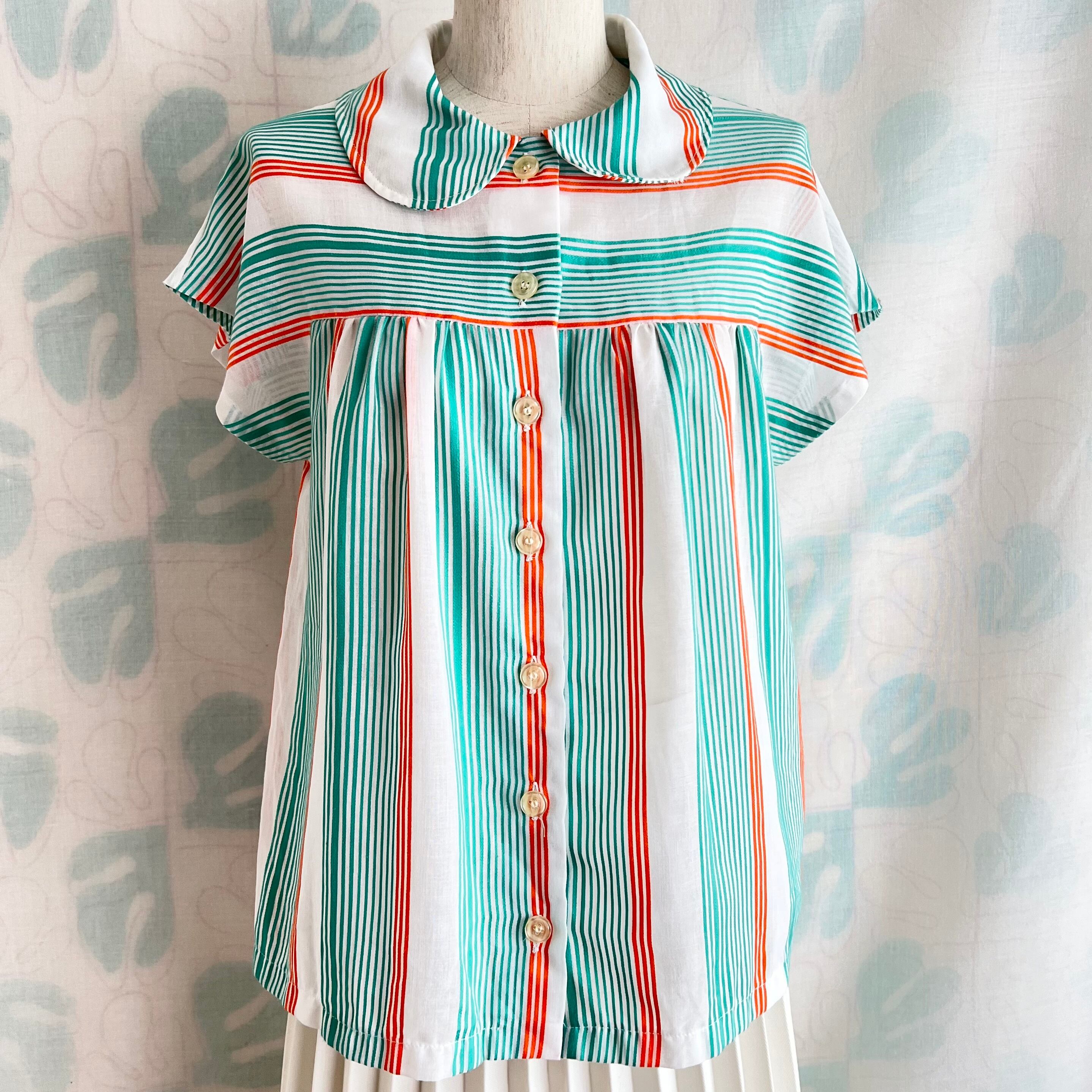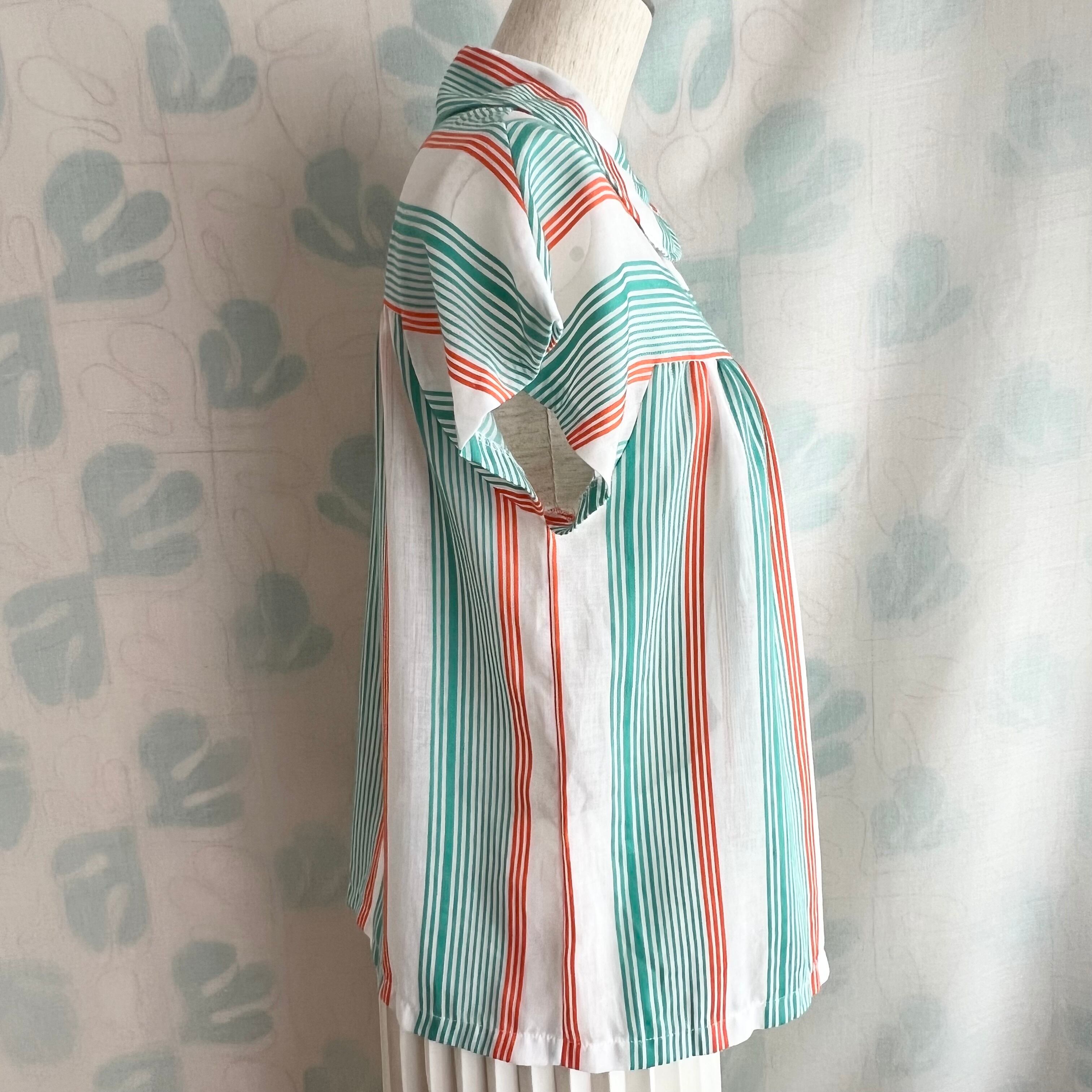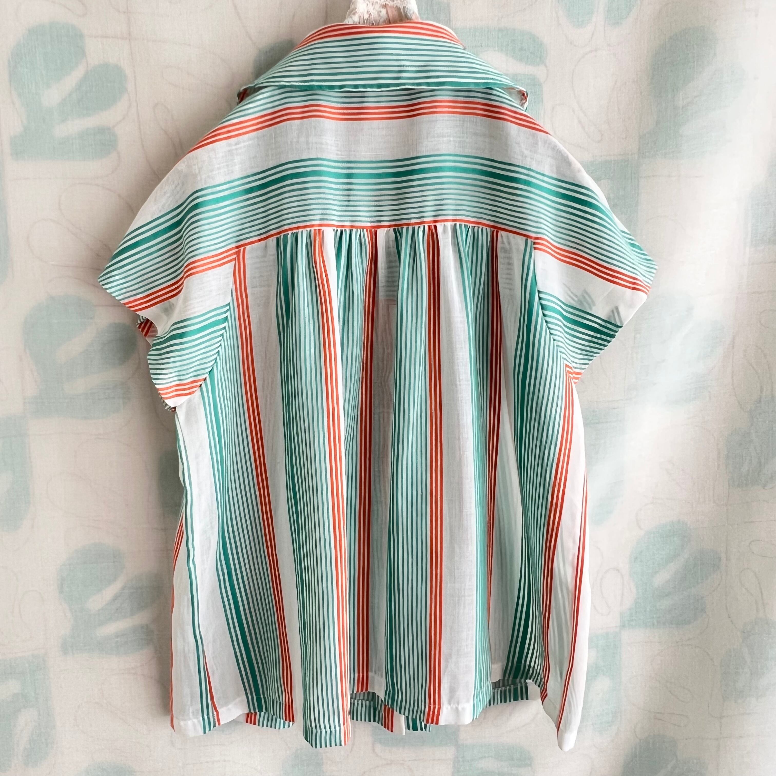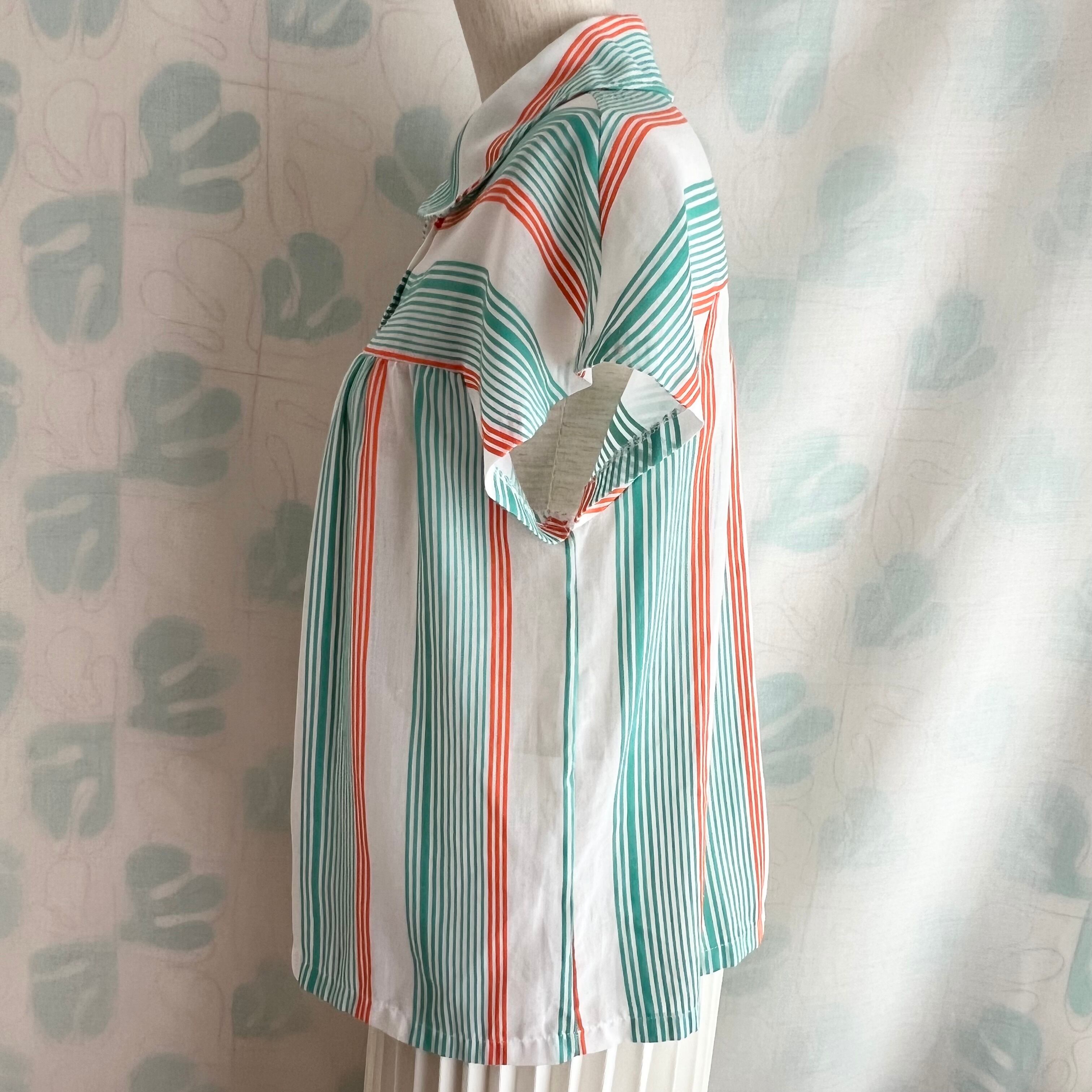 80's 2色ボーダー×ストライプ フレンチスリーブ シアーブラウス。