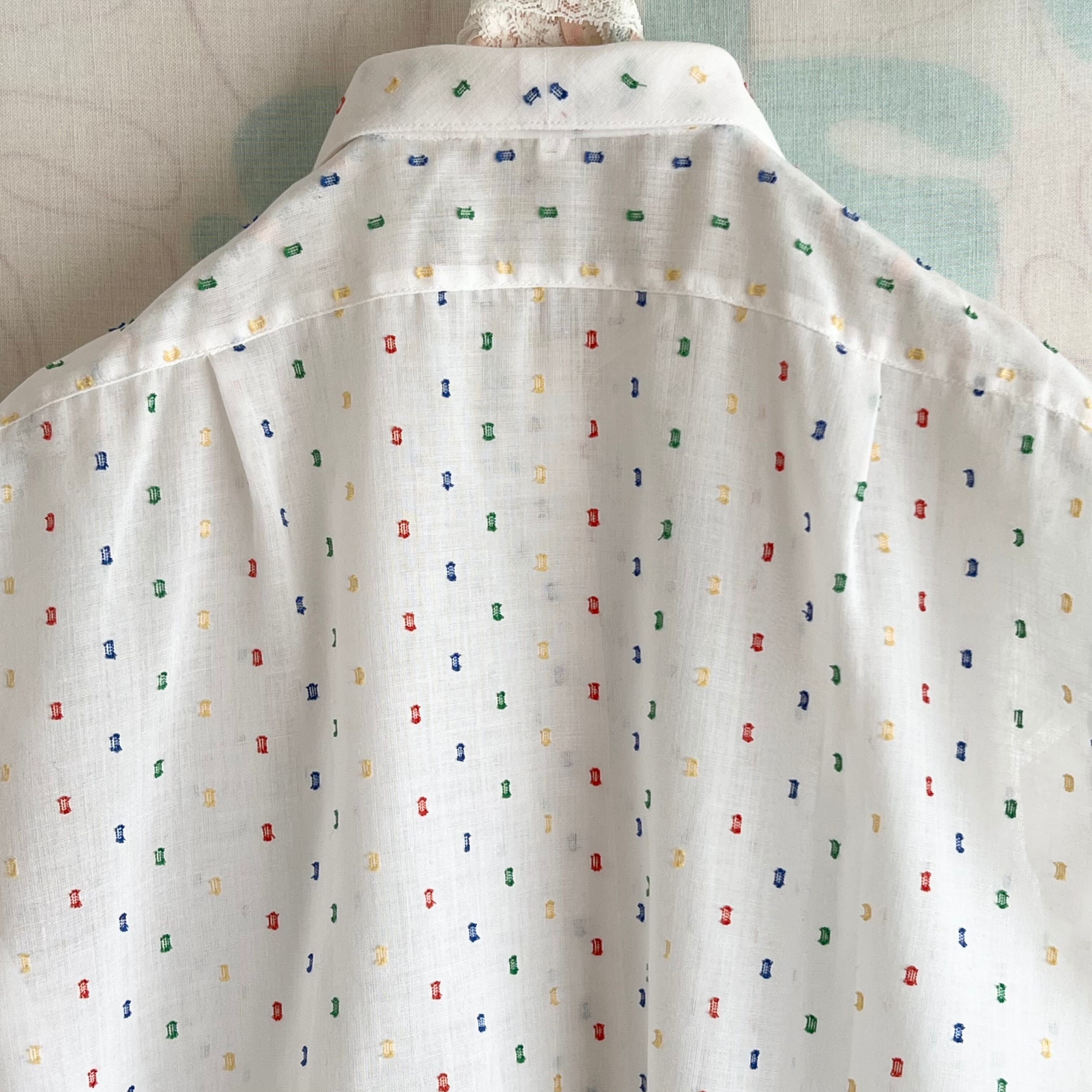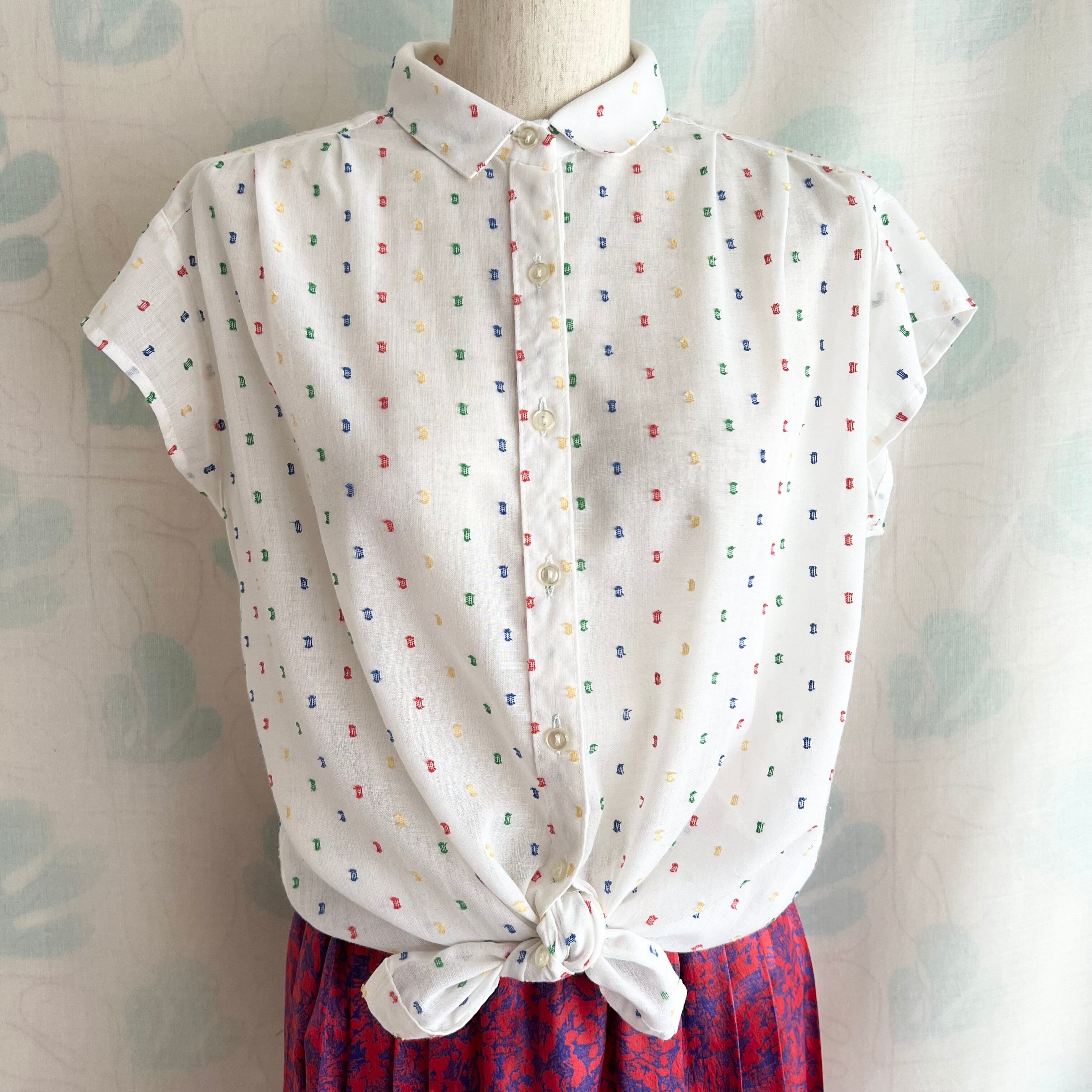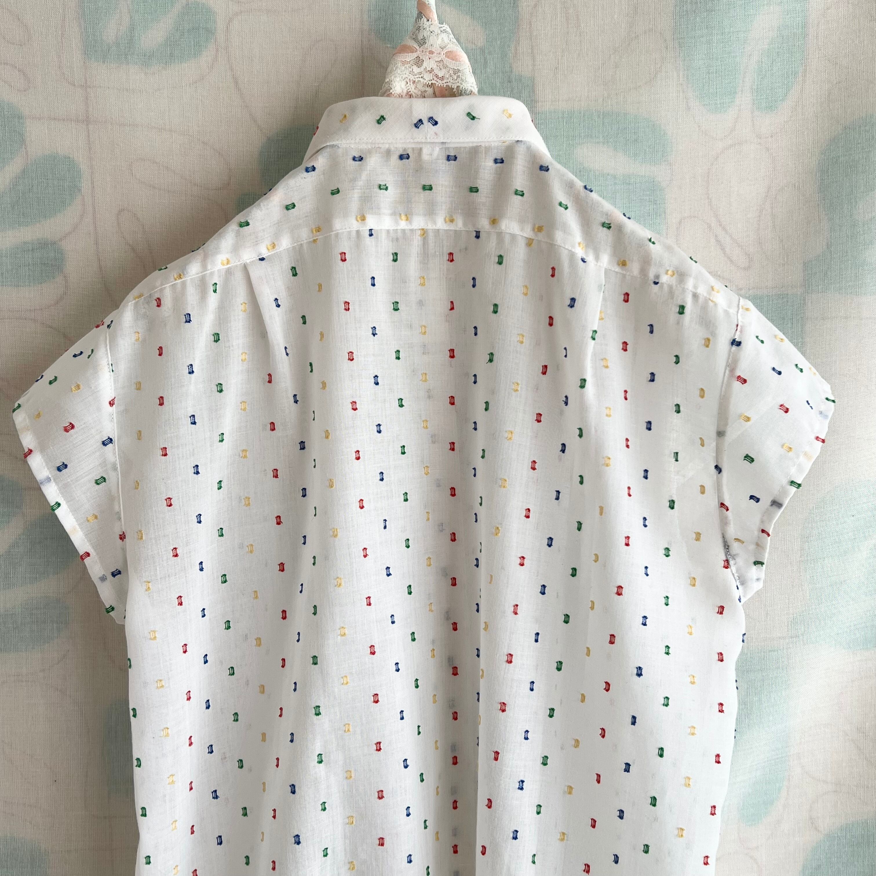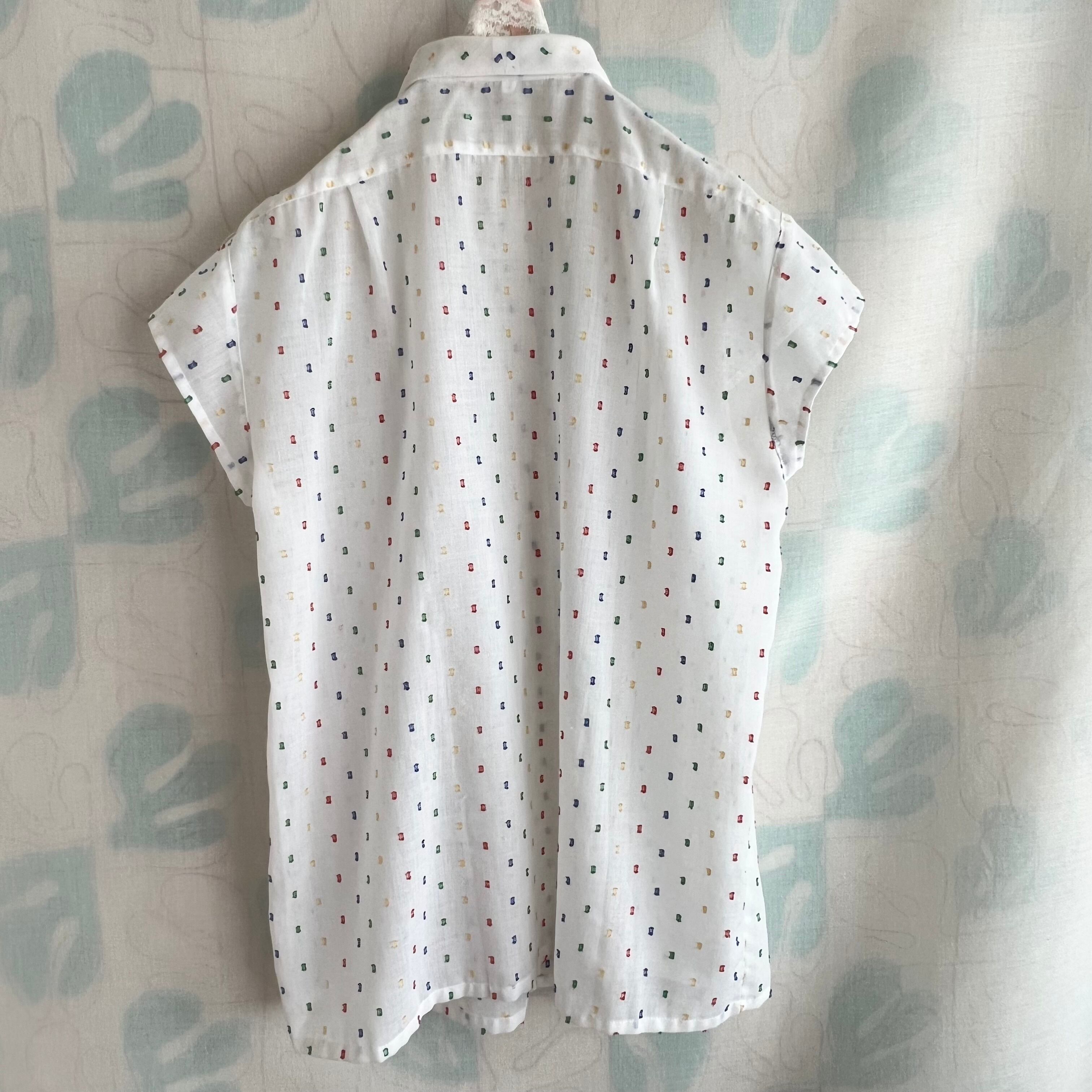 80's White x color yarn sheer French sleeve blouse