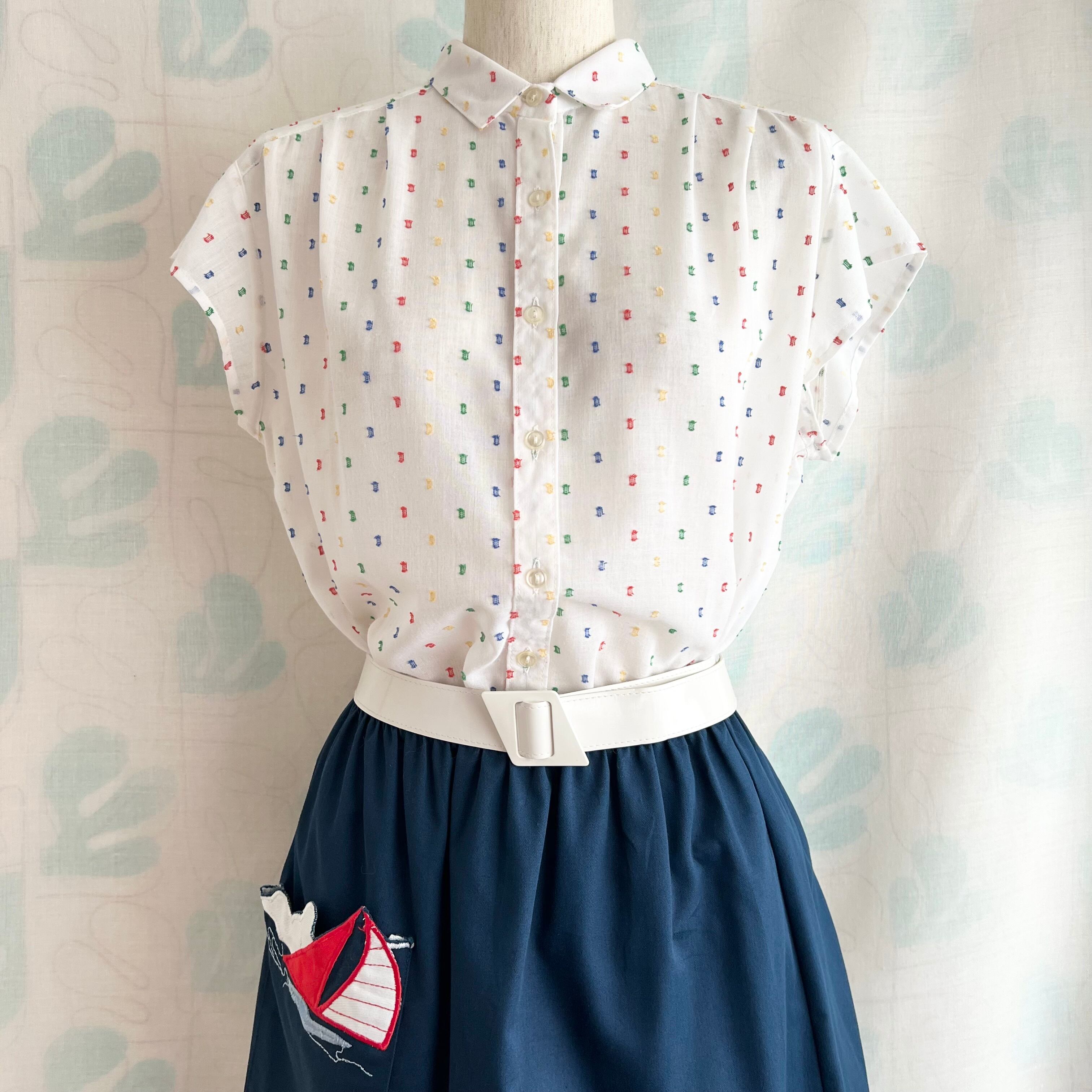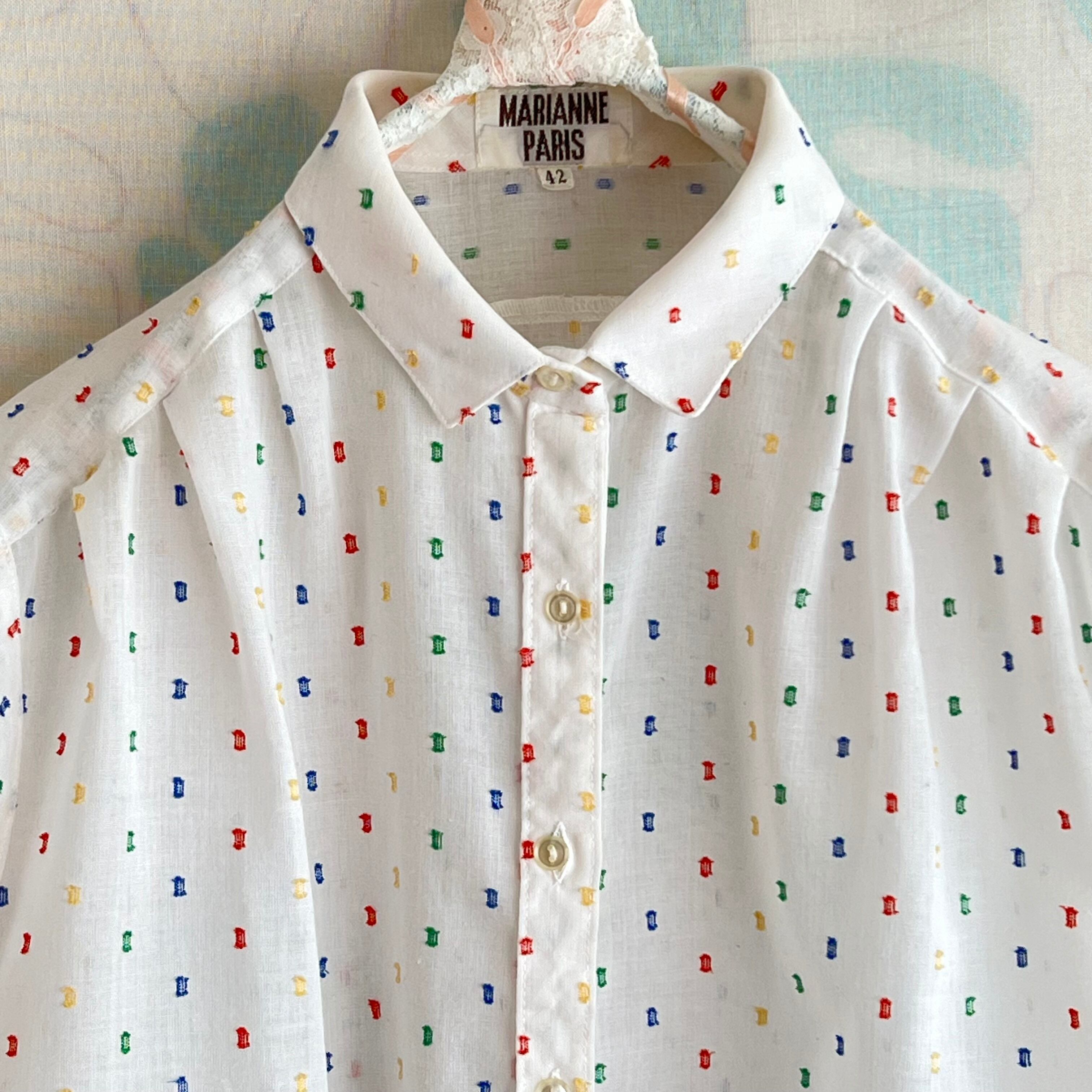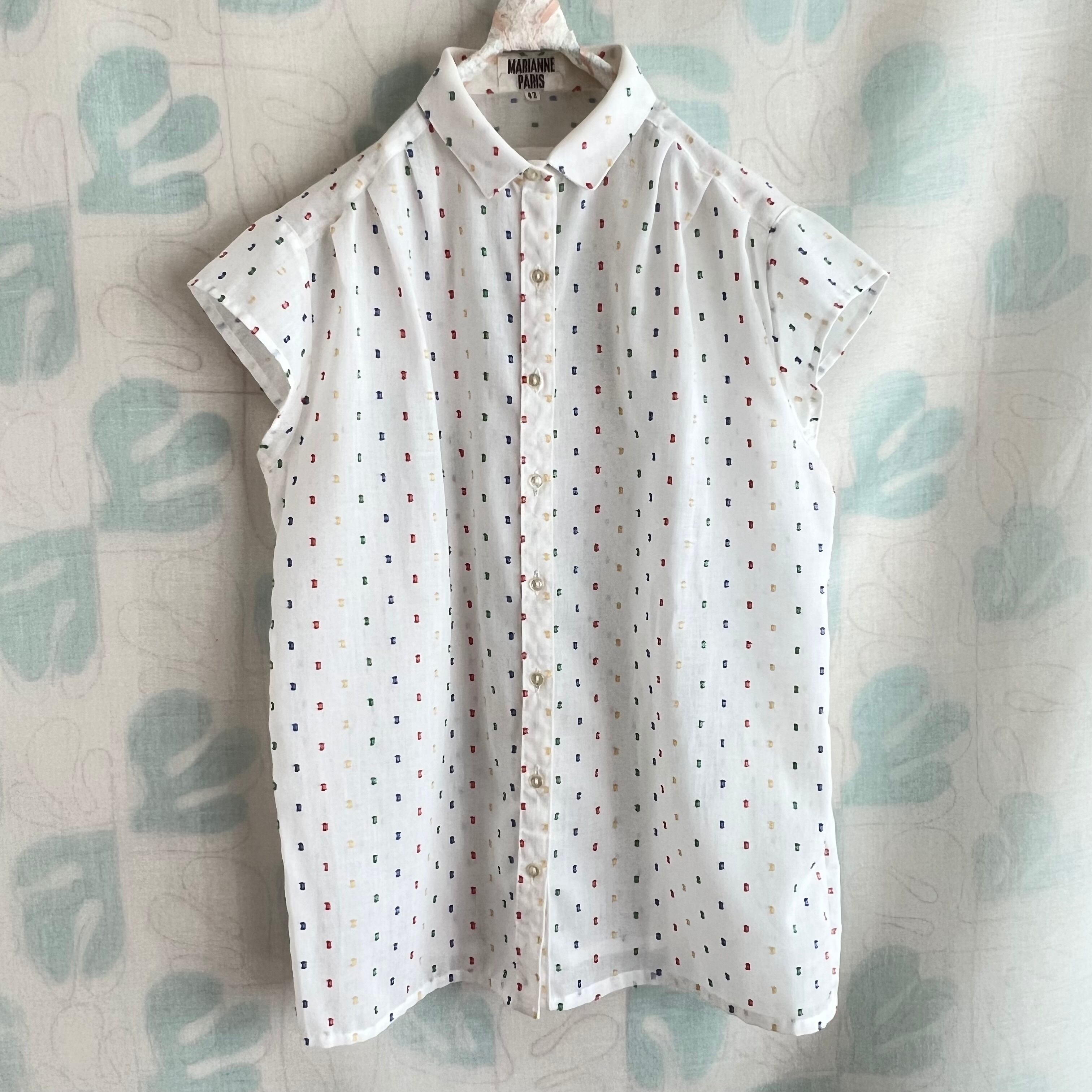 80's 白×色糸 シアーフレンチスリーブブラウス。