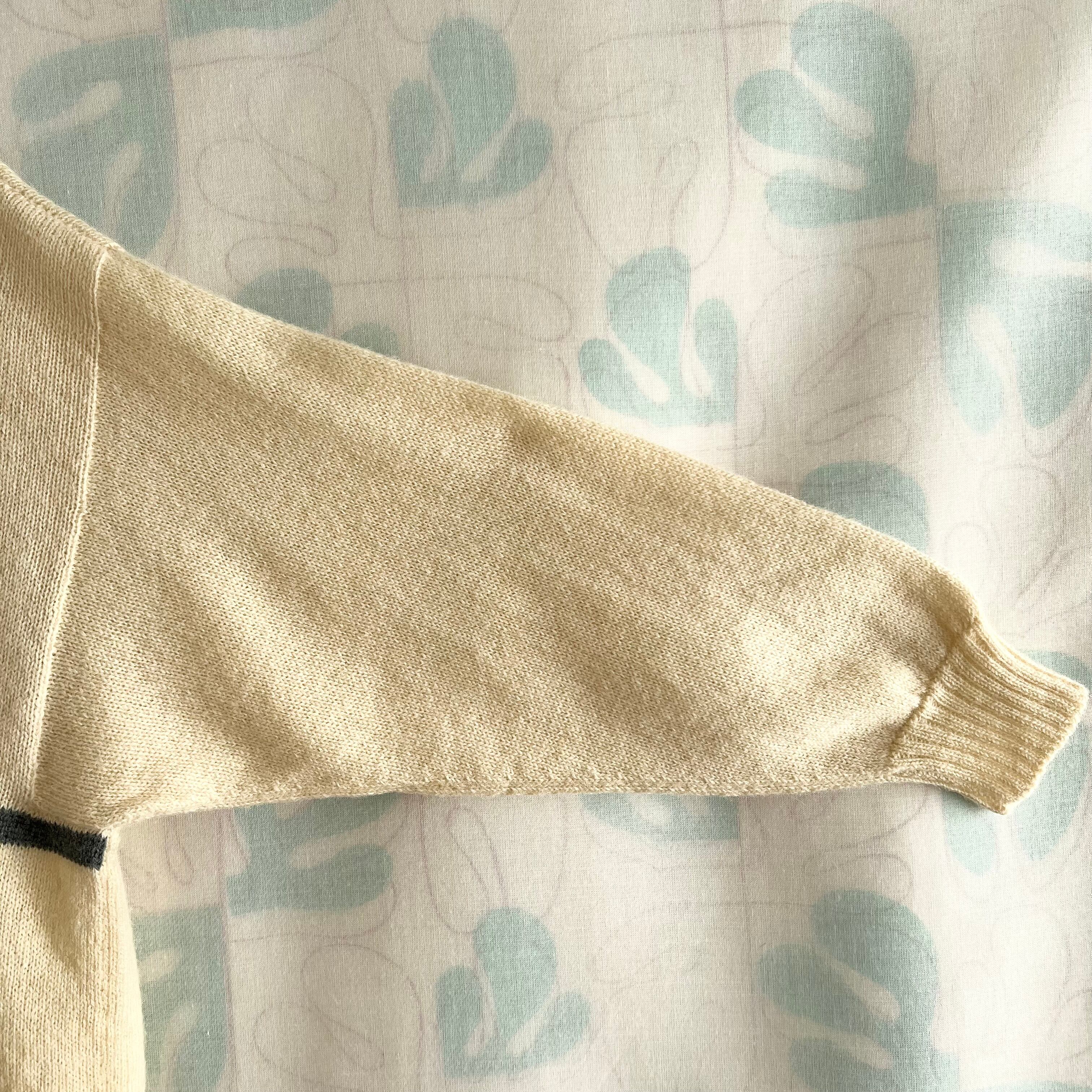 クチバシの長い綺麗色の2羽の鳥。羽ばたいている子と枝に留まって遠くの森を眺めている子。風景画を思わせるほっこりしてしまう柄のセーターです。